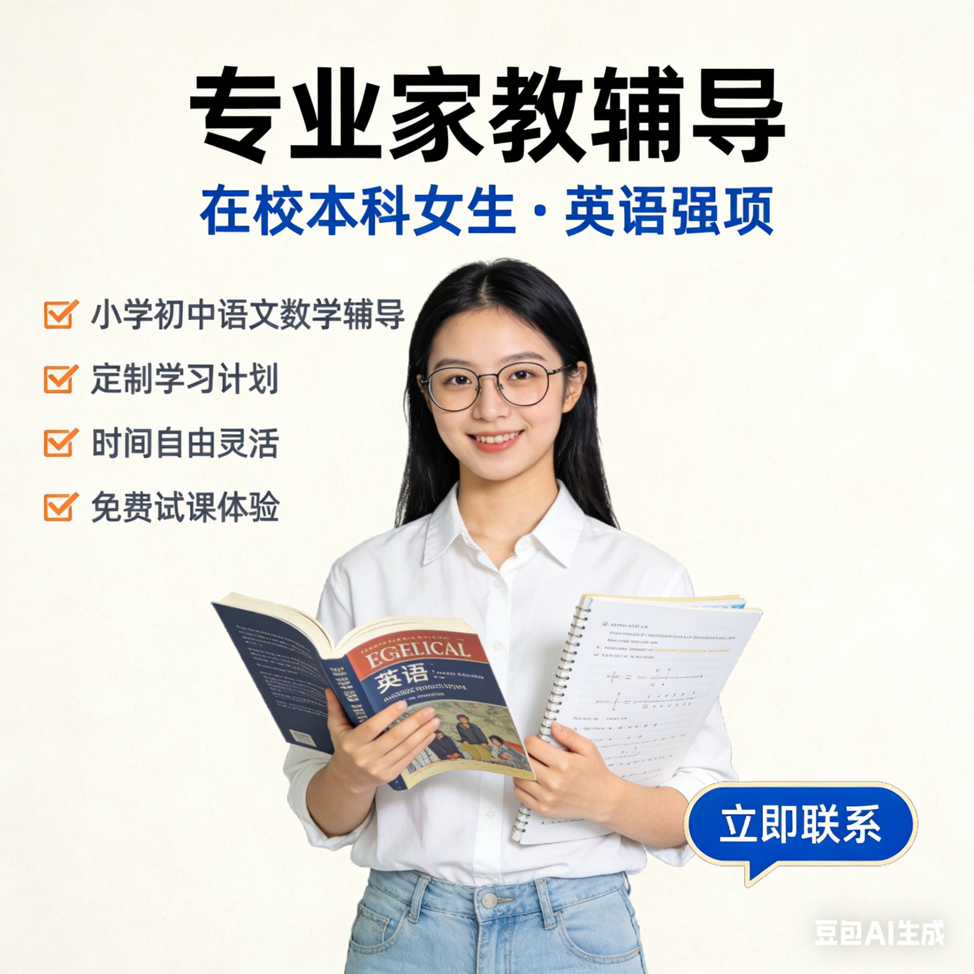 本人在校本科女,英语强项,语文数学均可,可辅导小学初中,针对个人学习情况制定计划,时间自由可随时约,价格可商议,可免费试课一节,有需要可联系微信/电话