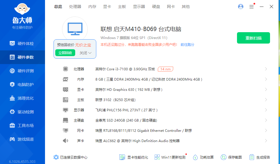 配置:飞利浦27寸/联想原装主机/i37100/8g运行/240g固态
