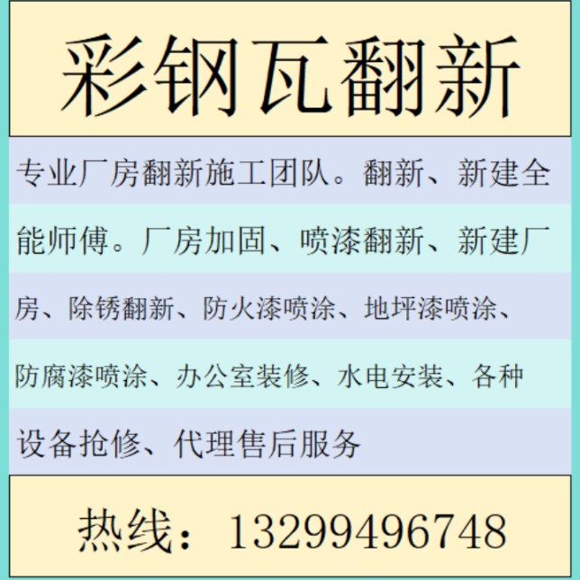 专业承接钢结构厂房铁锈转化剂翻新、喷涂改色、拆旧换新瓦、厂房加固、渗水补漏。优质服务让客户省力又省心。团队执行力、责任心强,敢于挑战各种高难度抢修工程。
